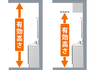 より高い洗面台に取り替えたい場合、まず、上部に干渉するものがないか確認が必要です。もし干渉物があれば、干渉物下までの距離が、設置に使える有効の高さとなります。